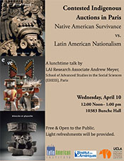 Andrew will make a comparison between Native American tribes and Latin American nations who have both requested repatriation of Indigenous objects being auctioned in Paris, France. Similar to Native nations in the Southwest United States, countries such as México and Perú have contested sales in Paris and demanded the return of cultural patrimony that left the country illegally. However, there are many differences between the Latin American and Native North American contexts. Unlike how objects are repatriated to specific tribes and religious practitioners in the United States, Pre-Columbian items returned to countries like México are placed in national museums. Contemporary Indigenous peoples in México and Perú rarely request repatriation of objects.