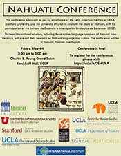 This conference is brought to you by an alliance of the Latin American Centers at UCLA, Stanford University, and the University of Utah to promote the study of Nahuatl, with the participation of the Instituto de Docencia e Investigación Etnólogica de Zacatecas (IDIEZ). Thirteen international scholars, including three native-language speakers of Nahuatl from Veracruz, will present their research on Nahuatl language and culture.