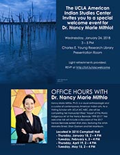 Dr. Nancy Marie Mithlo is offering office hours during her visiting scholar appointment at the UCLA American Indian Studies Center. All office hours are held in 3215 Campbell Hall.