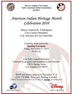 Tuesday, November 9th, 2010, 6:30 PM Buffet Reception, 7:30 PM Awards Ceremony hosted by Hattie Kauffman, Emmy Award-winning reporter featuring live traditional bird singing, dancing, and drumming at the KCET Studios 4401 Sunset Blvd, Los Angeles CA 90027. Celebrate American Indian Heritage Month with KCET and San Manuel Band of Mission Indians. For more information and to RSVP online, please visit the official website: 2010 Leadership Awards.