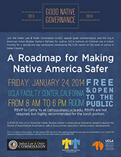 Join the Indian Law & Order Commission (ILOC), special guest commentators, and the UCLA American Indian Studies Center's Partners for Justice: UCLA Institute on Criminal Law in Indian Country for a special one-day symposium showcasing the ILOC report on the state of justice in Indian Country. Download Agenda (PDF) – this is a draft agenda and is subject to change. This event is free and open to the public. Please RSVP to Cathy Yu, cathyyu@aisc.ucla.edu. RSVPs are not required, but highly recommended.