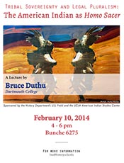 A lecture by Bruce Duthu, Samson Occom Professor of Native American Studies and Chair of the NAS Program at Dartmouth College. Sponsored by the UCLA Department of History and the UCLA American Indian Studies Center. For more information: lisa@history.ucla.edu |