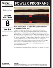 This afternoon program pairs two speakers who discuss how diverse Native American artworks have circulated in commercialized systems. Kathy M’Closkey, author of Swept Under the Rug: A Hidden History of Navajo Weaving (2008), chronicles the historical background evidenced by trading post archives, while Jim Enote of the Zuni Nation exposes the development of "pseudo-ceremonial" Zuni works of art. The program concludes with a screening of Weaving Worlds, a documentary film that highlights the untold stories of artists and dealers involved in the making and selling of Diné (Navajo) rugs. The film presents a compelling portrait of the economic and cultural struggles that Diné (Navajo) weavers face in a time of increased globalization. Light refreshments will be served afterwards. Event link: http://fowler.ucla.edu/events/trading-posts-today-commodification-american-indian-arts Co-sponsored by the UCLA American Indian Studies Center and the Ethnic Arts Council. |