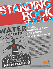 We are also concerned about the resisters at Standing Rock. The day after the election, the DAPL builders announced they plan to defy President Obama’s request to stand down and begin drilling within two weeks. We are certain to see tensions there rise in the coming days. Please join us for a Standing Rock Teach-in on Tuesday, November 15 at 3:30 in Dickson Plaza North (between Haines and Dodd) where we will discuss the current situation and hear from faculty and students who have visited Standing Rock in recent weeks.