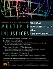 Join us for a special lecture on "Multiple InJustices: Indigenous Women, Law, and Political Struggle in Latin America" presented by R. AÃda Hernández Castillo, Professor and Senior Researcher, Center for Research and Advanced Studies in Social Anthropology, Mexico City, Shannon Speed (Chickasaw), Director of the UCLA American Indian Studies Center, and Associate Professor of Gender Studies and Anthropology, and Brenda Nicolas (Zapotec), Doctoral Candidate in the UCLA Department of Chicana/o Studies. Light refreshments will be provided. RSVP at http://bit.ly/multiple-injustices Co-sponsored by the UCLA Chicano Studies Research Center and the UCLA Latin American Institute |