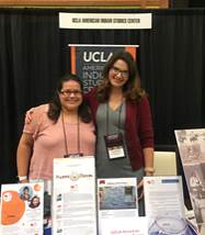 Caption: AISC Librarian Joy Holland and Librarian and Archivist Xaviera Flores, a colleague from UCLA Chicano Studies Research Center welcomed visitors in the UCLA American Indian Studies Center Booth at ATALM.