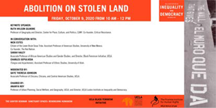 On Friday, October 9, 2020 the Institute on Inequality and Democracy will inaugurate the Sawyer Seminar on Sanctuary Spaces by convening activist-scholars who will trace the histories and futures of abolition on stolen land and deeply examine ongoing uprisings for Black freedom and Indigenous sovereignty against empire. Co-sponsored with UCLA Luskin Institute on Inequality and Democracy.