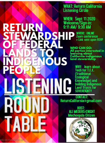 The next Return California event will focus on traditional ecological knowledge and building Indigenous land trusts for sovereignty and will be hosted by Ali Meders-Knight, Mechoopda Citizen, who was recently featured on North State Public Radio regarding wildfires, Indigenous knowledge and other matters. Click here https:// www.mynspr.org/post/qa-ali-meders-knight-mechoopdaindian-tribe#stream/0 for more information.