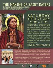 On Sunday, October 21, 2012, Catherine "Kateri" Tekakwitha, became the first American Indian to be canonized a saint of the Catholic Church. Who was Kateri and what significance does her sainthood hold for American Indian Christians today? Please join Clementine Bordeaux and Rebecca Rosser for a discussion of this historic event. Rebecca will give a brief overview of Tekakwitha's life, and Clementine will present photographs and screen clips from the video diary she is making of the canonization.