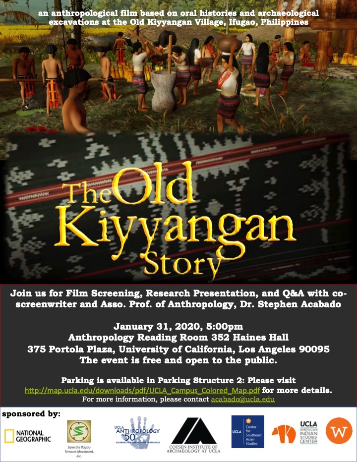 Join us for film screening, research presentation, and Q&A with co-screenwriter and Associate Professor of Anthropology, Dr. Stephen Acabado. The Old Kiyyangan Story is an anthropological film based on oral histories and archaeological excavations at the Old Kiyyangan Village, Ifugao, Philippines.