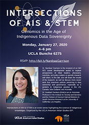 Intersections of AIS & STEM presents "Genomics in the Age of Indigenous Data Sovereignty," a talk by Dr. Nanibaaʼ Garrison (Diné), who is the recipient of an NIH K01 career development award to explore perspectives of tribal leaders, physicians, scientists, and policy makers on genetic research with tribes. In this talk, she will share the results of the research, as well as discuss more recent work that examines policies pertaining to data ownership and governance, especially as it pertains to Indigenous peoples in the US, Canada, New Zealand, and Australia.