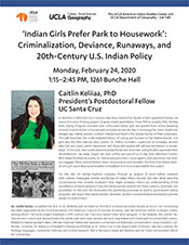 In Northern California's San Francisco Bay Area, behind the façade of well-appointed homes, lie traces of a once-thriving project of government assimilation. From 1918 to roughly 1942, the Bay Area Outing Program recruited over a thousand Native girls and women from Indian boarding schools to work as live-in housemaids in homes across the Bay. In exchange for room, board and meager pay, Native women cooked, cleaned and lived in the private homes of their employers. This talk examines the underanalyzed history of outing and focuses on the Native women and girls who fled this coerced labor system. Dr. Keliiaa considers a spectrum of runaways; women who had very hasty, public departures and those who quietly left without permission or knowledge. To this end, she closely examines powerful stories of women and girls who expressed their dissatisfaction, ran away, stayed out past curfew and wound up in Bay Area detention homes. With these firsthand accounts, Dr. Keliiaa uncovers their crucial agency and autonomy. Her analysis engages three central themes; labor, incarceration and sexuality. She finds that Native women and girls were disproportionately criminalized and incarcerated within this system.