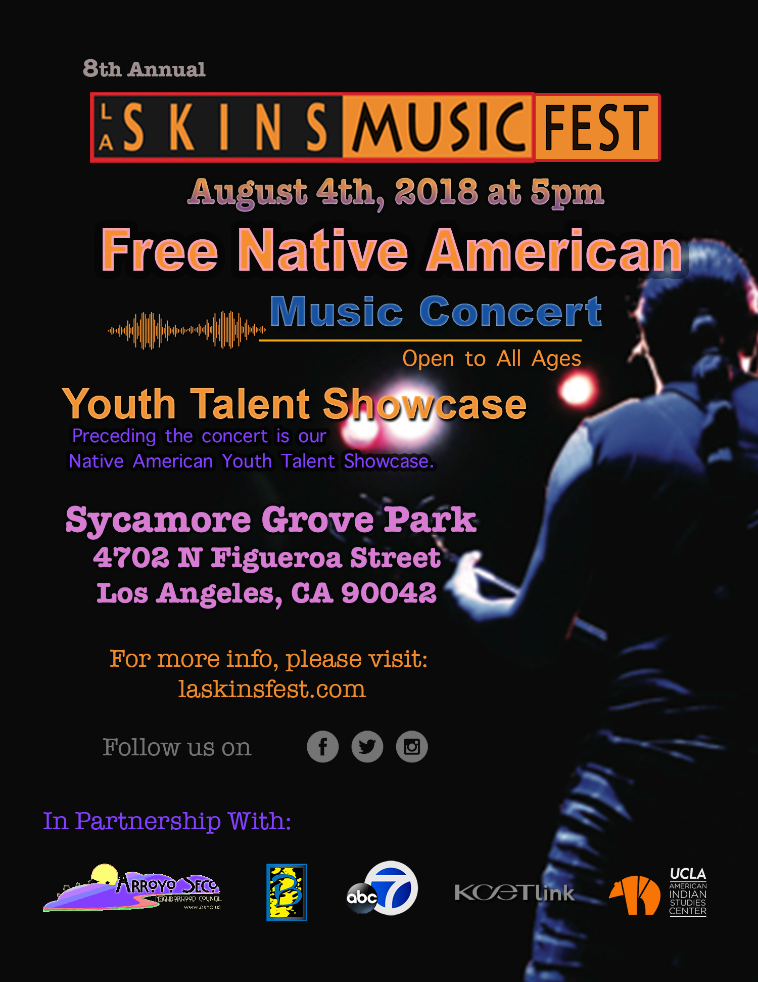 The 8th Annual L.A. SKINS MUSIC FEST, taking place August 4th, 2018, is a free showcase that will feature contemporary Native American music such as pop, jazz, rock and R&B. This year’s concert takes place at the Sycamore Grove Park in Highland Park, CA.