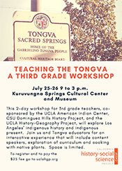 This 2-day workshop for 3rd grade teachers, co-sponsored by the UCLA American Indian Studies Center, CSU Dominguez Hills History Project, and the UCLA History-Geography Project, will explore Los Angeles' indigenous history and indigenous present. Join us and Tongva educators for an interactive experience that will include content speakers, exploration of curriculum and cooking with native plants. Space is limited.