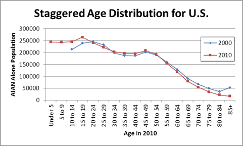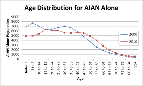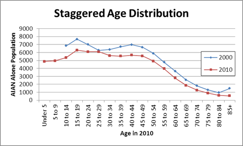 In other words, the observed population at time "t" (2010) is the surviving base population plus net change in racial identity, which could be either positive or negative. Figure 6 provides a visual representation of this for the single-race AIAN population broken down by age groups, with the 2000 line shifted to account for the decade time difference. The gap between the top line (2000) and the bottom line (2010) is due to deaths and shifting identity.