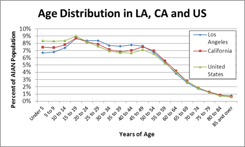An alternative way of analyzing the possible implication of the decline in the number of childbearing AIANs in this region is to compare the age profiles of Los Angeles to that for the state and nation. As seen in figure 3, Los Angeles had relatively fewer youths and more childbearing-age adults. This implies that the fertility rate in Los Angeles is noticeably lower than for the other two geographies.