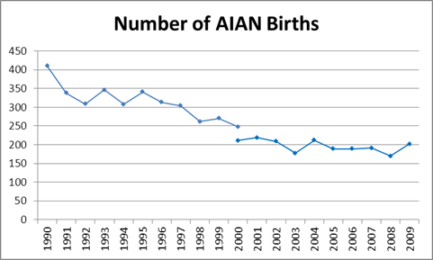The 2000 number when two or more races were reported was 85.1% of the previous 2000 number. If the 1990-1999 numbers are adjusted by the ratio derived by comparing the two different 2000 figures, then there were an estimated 2,723 AIAN alone births between 1990 and 1999. Compared to this figure, there were only 72.3% of the number of births in the 2000–2010 period. Compared to the census, which reported 14,520 children under the age of 10 in 2000 and 9,810 in 2010, there were only 67.6% of the number of children under age 10 in 2010 compared to 2000.