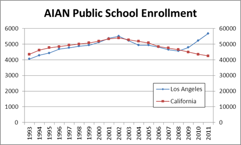 Other indicators are a decline in birthrates and a decline in school-aged children. From 1990 to 1999, there were 3,201 AIAN births in Los Angeles; from 2000 to 2009, there were only 1,969. The Los Angeles Department of Public Health changed its reporting method and added a category for two or more races. Two different numbers were reported for 2000 by the Department of Public Health, but the number from the more recent data—after the Department of Public Health reported two or more races—is used here (see fig. 4).