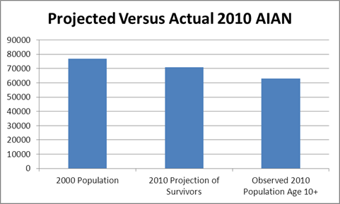 We estimated the number of survivors by first estimating the number of deaths, using IHS national level mortality rates from the report, "Indian health Care." Using this data, an estimated survival rate was calculated for each age bracket based on the IHS brackets by weighing the survival rates by the years each cohort would spend in that bracket over the ten-year period. The survival rate was then compounded each year in order to estimate the survivors from each age bracket, then summed to estimate the total number of survivors. Based on these calculations, we would expect to see in 2010 roughly 71,000 single-race AIANs ten years and older, assuming no out- or in-migration. However, the actual AIAN population was significantly lower (63,000), indicating that net migration was negative (8,000), thus contributing to the observed reduction in the number of AIANs in this region (see fig. 7). The impact of net migration, however, can be either under- or overestimated because the above does not account for shifts in racial identity between the two decades.