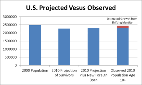 We use the same method to calculate deaths and the suriving population. We esimated the number of suvivors to be approximately 2,267,000 out of the base population of 2,476,000. The estimate is considerably lower than that reported for 2010: 2,444,000. We account for net international migration by comparing the number of foreign-born AIANs counted in the 2000 decennial census and in the 2006-10 American Community Survey, which shows a net growth of 23 thousand. Even after making this adjustment, there is still a sizable growth that cannot be accounted for by death and net migration. This "excess" growth is estimated to be 6.3% of the observed 2010 population over age ten, or about 154 thousand (see fig. 9). Although we have no evidence that shifting racial identity has affected the AIAN count in Los Angeles, the national analysis demonstrates that this phenomon is both plausible and probable.