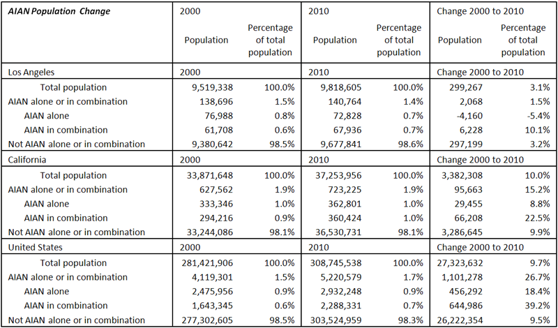 This brief examines the AIAN (American Indian and Alaskan Native) population between 2000 and 2010 in Los Angeles and estimates the components of change. The total at any point in time provides information on the size of the AIAN population in Los Angeles County, and it is useful to compare that number to the total population in the region and to the AIAN population at other geographic levels (e.g., for California and the nation). Comparison over time provides a sense of the rate of growth or decline. We start in this introduction with a discussion of basic concepts and data sources.