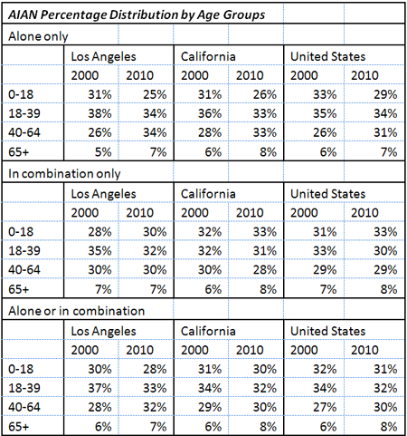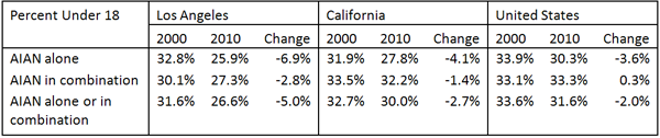 A more important change is in the youth share of the AIAN population in Los Angeles. The tabulations indicate a dramatic decline among single-race AIANs, a decrease of about 6 percentage points. There are similar, but slightly smaller, declines for California and the United States. In all three geographies, the decline is partially offset by an increase in the youth share of the multiracial AIAN population.