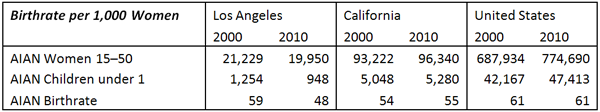 The U.S. Bureau of the Census reports fertility as the number of births in the last 12 months per 1,000 women aged 15-50 in the ACS. This can be calculated for the 2000 and 2010 enumeration by calculating the ratio of children under 1 to the number of women aged 15-50. As shown in table 3, while the rate stayed steady on the national level and slightly grew in California, there was a large drop in the Los Angeles levels. However, this estimation only accounts for a single year of births. Unlike the ACS, only AIAN mothers who have an AIAN alone child are counted in this estimate.